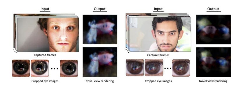 By imaging the eyes of a moving individual, the team collected multiple views of the surrounding environment through the reflections in the eyes. Overcoming challenges such as accurate eye pose estimation and iris texture, they developed a method that utilizes the approximate geometry of the cornea and trains a radiance field on eye reflections.