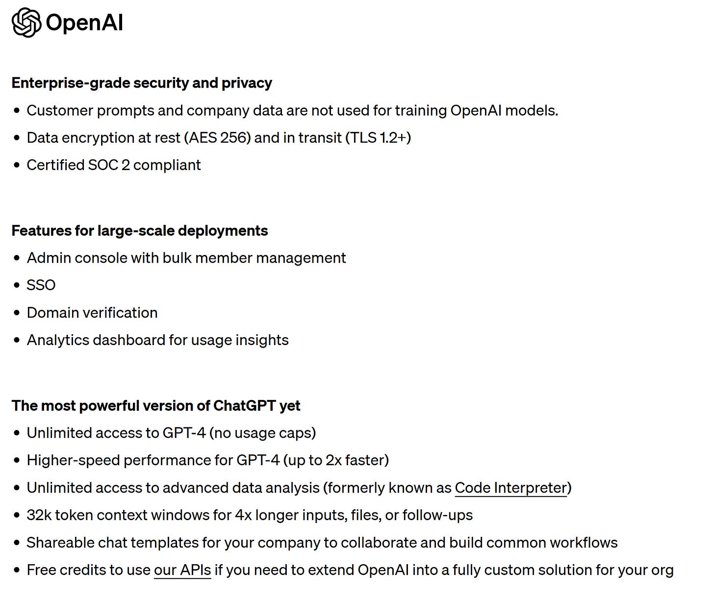 OpenAI just launched ChatGPT Enterprise, the beloved product now suited with “enterprise-grade security and privacy.” In their full list of features, some standouts are a rebranding of Code Interpreter to “advanced data analysis” and shareable prompt templates for your company.