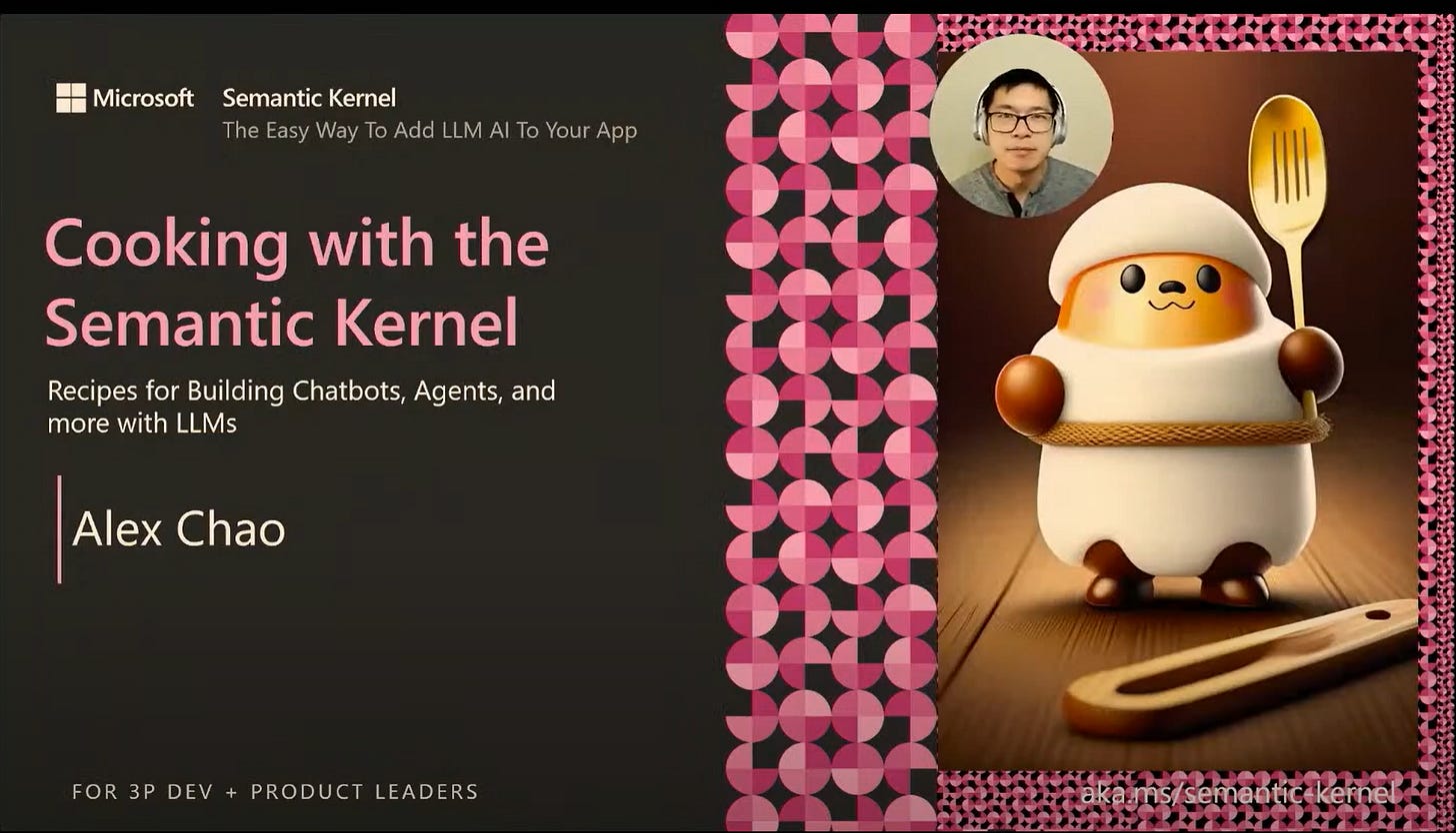 As mentioned in yesterday’s newsletter, I got to give a recorded talk at the AI Engineer Summit titled “Cooking with the Semantic Kernel: Recipes for Building Chatbots, Agents, and more with LLMs.” If you want to check it out, watch here!