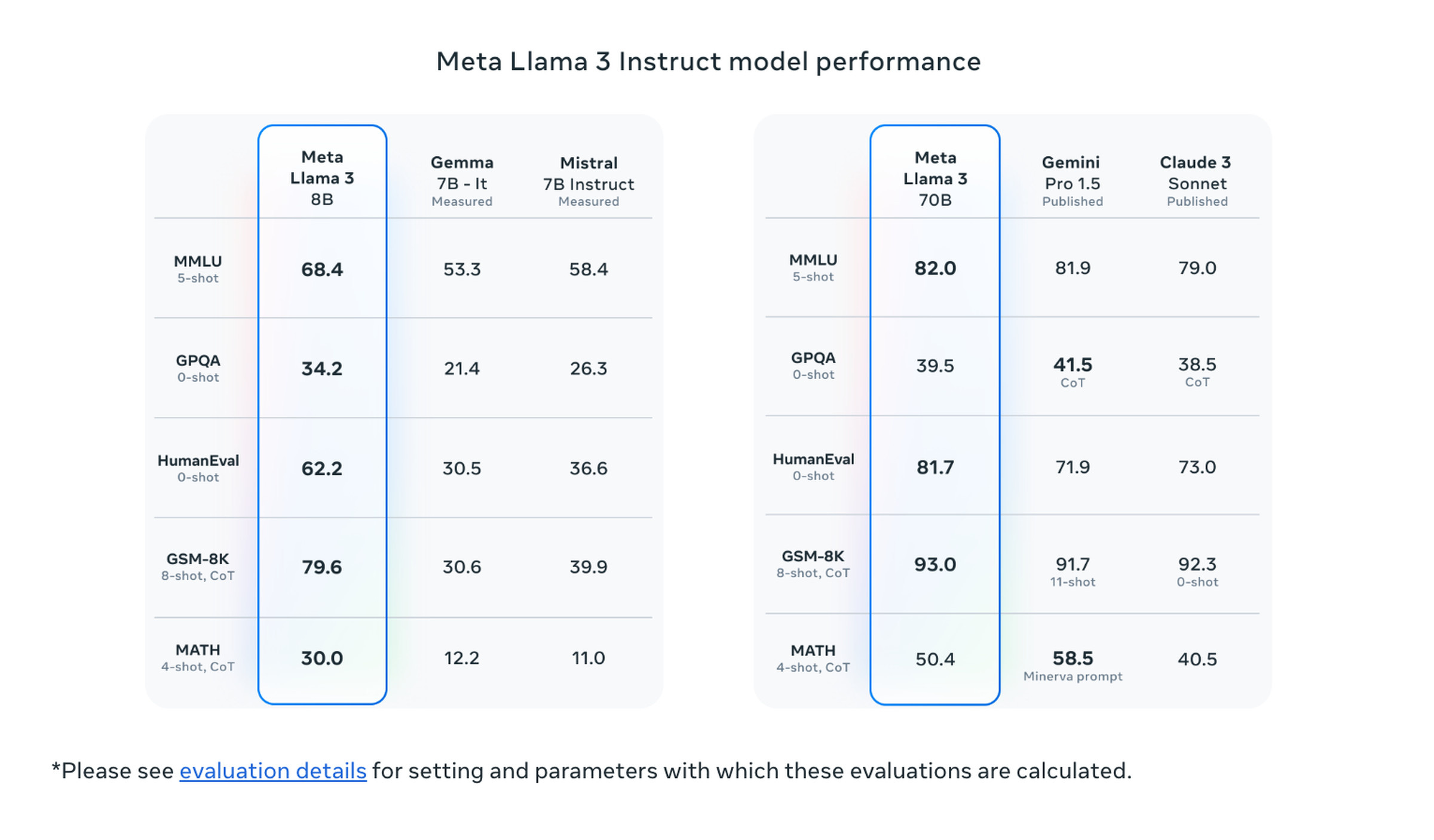 According to Meta, both the Llama 3 8B and 70B parameter model beat similarly sized models like Google’s Gemma and Anthropic’s Claude 3 in certain benchmarks (with a notable absence of comparing to OpenAI’s GPT4).