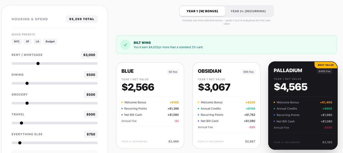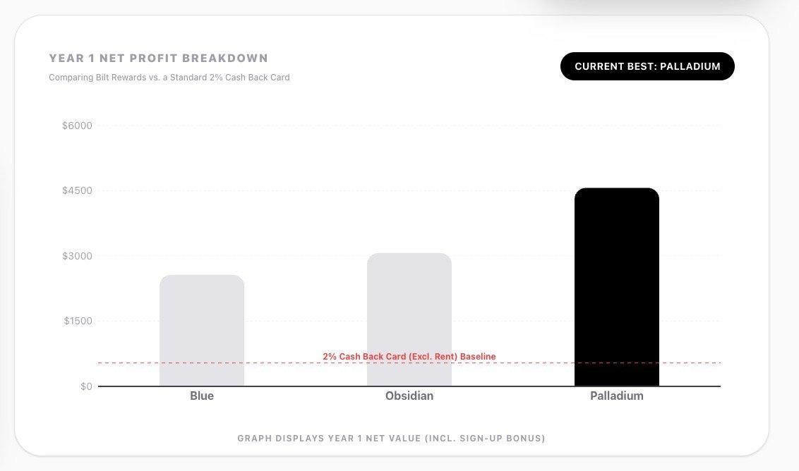 The app uses a standard 2% cash back card as a baseline, and will show whether Bilt nets ahead, giving you a breakdown of the profit in Year 1 when you have sign-on bonuses vs Year 2 and beyond when you have to rely on the merits of the card without bonuses.