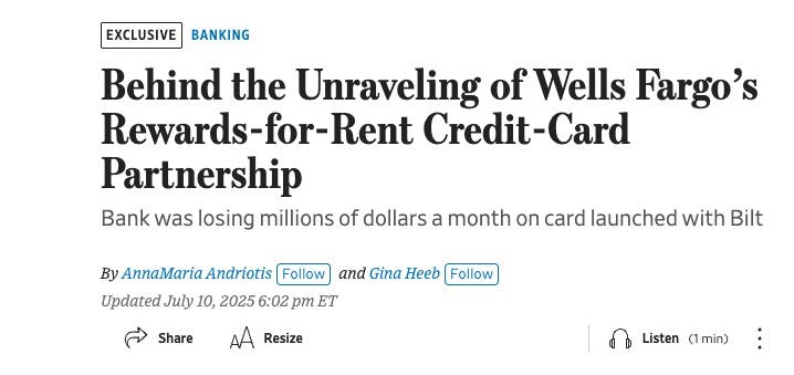 The result was that Bilt and their partner Wells Fargo were hemorrhaging money. People weren’t spending enough or carrying balances. It was so bad that Wells Fargo had to bail out of their partnership, leaving Bilt to pivot to a 2.0 strategy